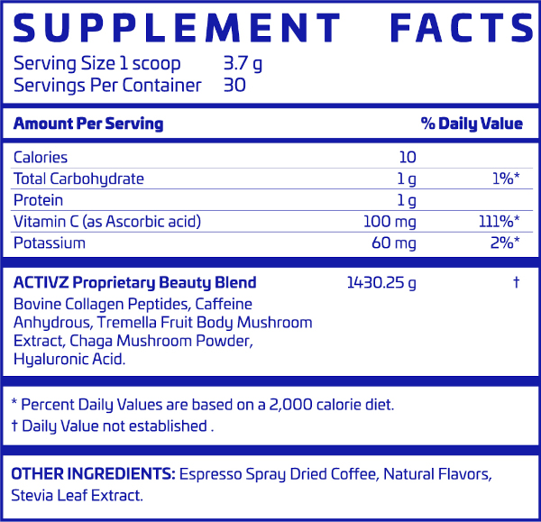 Our proprietary blend includes collagen peptides for structure and strength, Tremella and Hyaluronic Acid for deep hydration, and Chaga Mushroom for immune resilience. Vitamin C acts as the crucial activator that helps your body maximize collagen absorption and synthesis, while natural coffee polyphenols fuel your energy and metabolism. The result is a complete daily ritual that supports beauty, vitality, and performance — from the inside out. It’s more than coffee. It’s Everyday ACTIVZ.